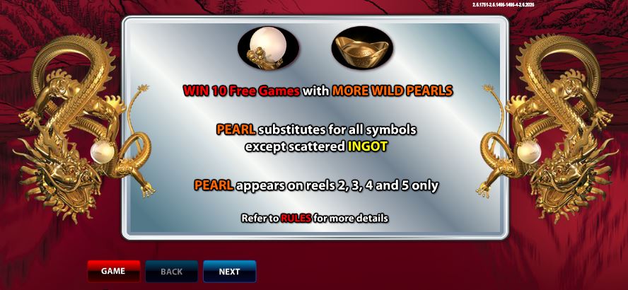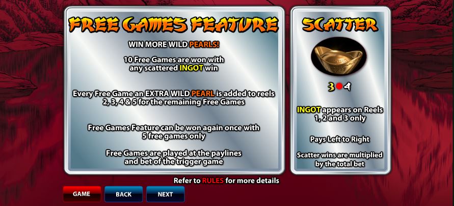 The wild symbol, the Pearl, will substitute for the regular symbols which appear on the last four reels of the slot. Since you don’t get it on the 1st reel, you shouldn’t expect to get a prize from it, as it can’t form its own combo. All it will do is the substitution which will take place whenever a wild is in position, appearing on a payline which already has a couple of matching icons and needs just one more to form the combo. The Gold Ingot is the only one which doesn’t benefit from the Pearl’s ability, as it is a scatter.