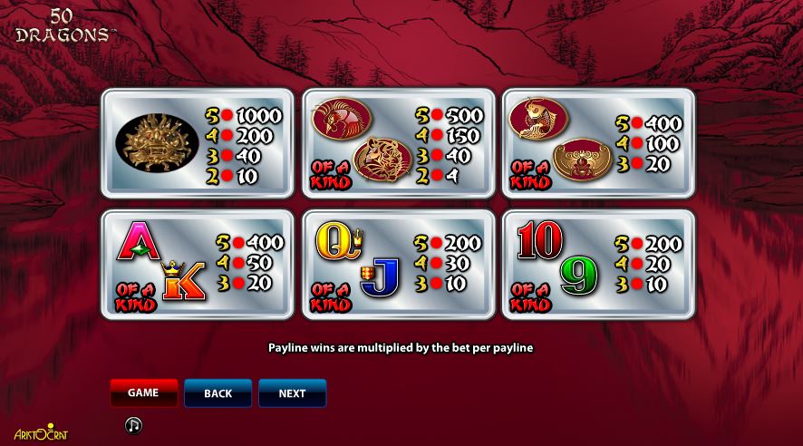 50 Dragons seems to be a sequel for 5 Dragons, both of them being games that were released by Aristocrat, a relatively new company when it comes to online gaming, but a big name in the land based slot industry. The game hasn’t been improved that much, and I’m still not a very big fan of what it has to offer, and I’m talking especially about the design here, as the features tend to look slightly better.