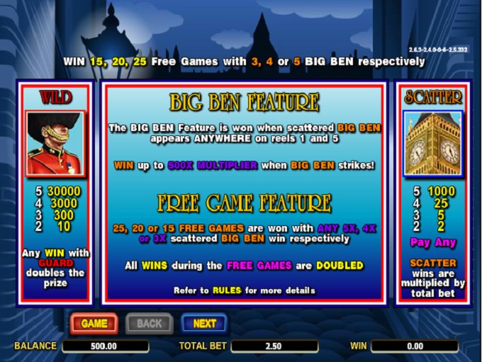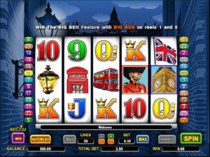 Symbols: Queen’s Guard (30,000 coins, wild), Big Ben (scatter, 1,000x the bet), Queen’s Crown (800 coins), Great Britain Flag (800 coins), Double Decker Bus (500 coins), Telephone Booth (400 coins), Street Light (250 coins), Tavern Sign (250 coins), King (125 coins), Queen (100 coins), Jack (100 coins), 10 (100 coins) & 9 (100 coins).