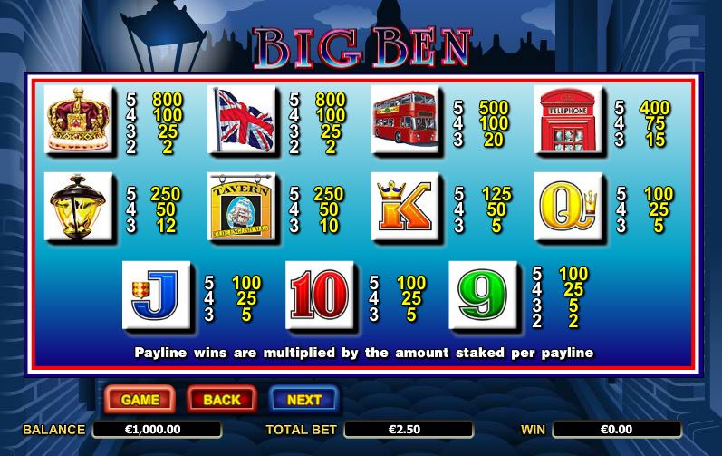 Whenever Big Ben is on the 1st and the 5th reels during the same spin, the Big Ben bell will chime. A random number of chimes will be heard, between 1 and 12. The prizes offered will vary between 2x and 500x.