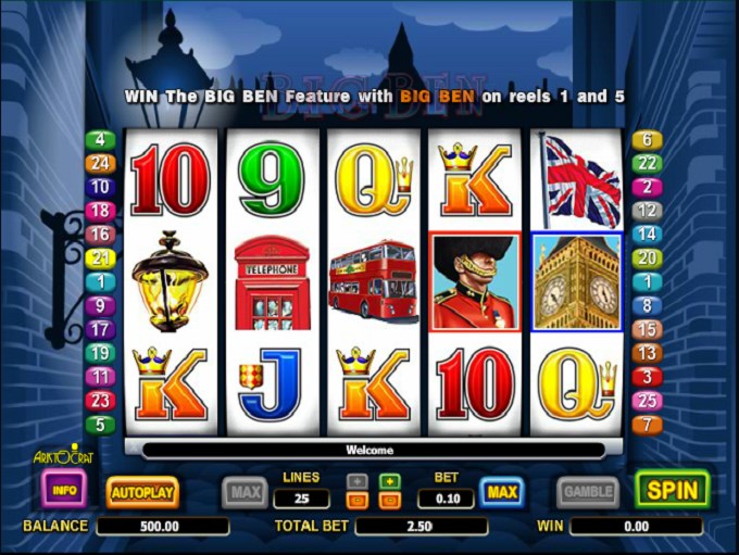 5 reels with 25 lines are used in Big Ben, a game which has a layout which Aristocratic seems to be fond of. The list of features includes the free games, their multipliers, the wilds and scatters. The game’s biggest payout is worth $60,000, which is one of the most impressive from the slots of this developer.