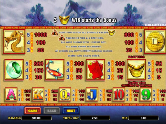 The other important symbol of this slot is the scatter, with the Gold Ingot representing it. This symbol appears on consecutive reels in order to be able to award you a prize, but it doesn’t matter where on them. They’re not that different from regular symbols actually, since in ways to win mode they work the same way. Payouts of up to 50x the triggering bet are possible when enough scatters are on those reels.