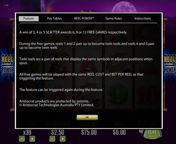 You’re getting 243 ways to win from the Reel Power feature, which uses up to 5 active reels. There are also free spins, twin reels, scatter symbols and wilds. Top prizes will go up to $2,500.