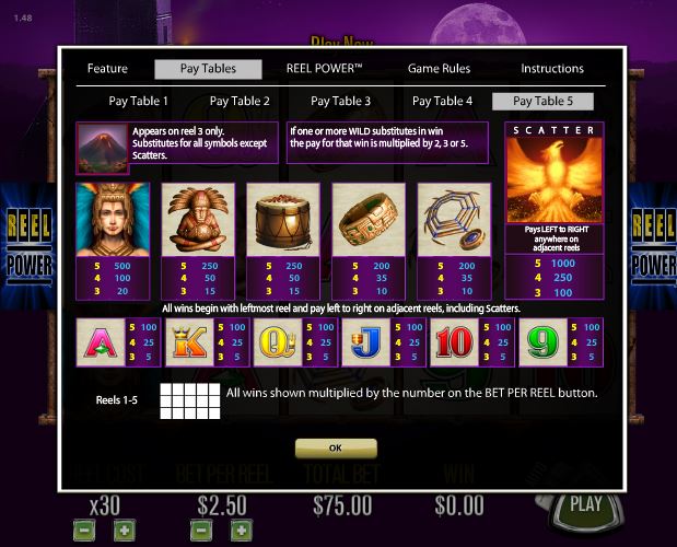 One unusual thing about this game is that depending on how many reels you activate, the paytable offers a different set of prizes, so you have both fewer chances to win and you get smaller prizes. It’s a good idea to keep all the reels active and use the maximum of 30 coins. Paytable 5 is the one you should be looking at if you wager the full amount.