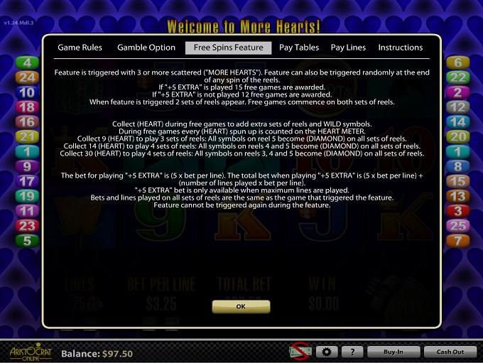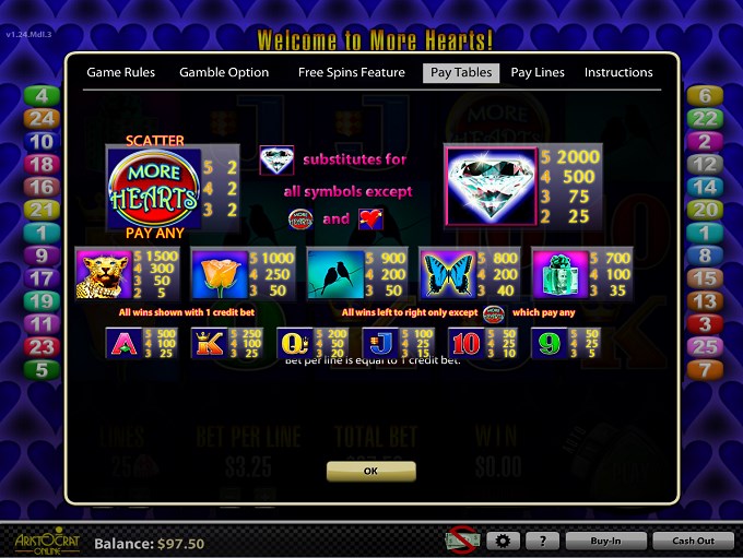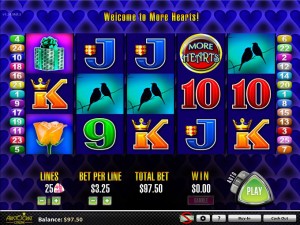 5 reels and up to 25 bet lines are offered in More Hearts. This slot offers wilds, free games and scatters, plus top payouts of $6,500.