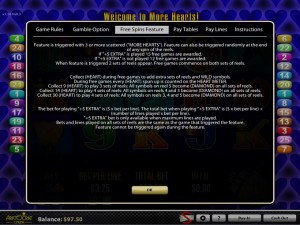 The More Hearts Logo symbol is also important, but not by offering you prizes directly. Instead, it is the scatter symbol of the game, allowed to appear in any random position. As long as you get at least three of them during the same spin, you will get a small reward of 2x the total bet and access to free spins.