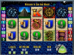 Designed by Aristocrat, Sun & Moon is a slot machine with modern features, but with a design which seems dated. The theme is inspired by the Sun and the Moon, but also by the Mayan culture. The Mayan calendar is well known, especially since people thought that its end a few years ago would bring in the end of the world. The Mayan inspiration is not original, South American civilizations being part of plenty of slot machines.