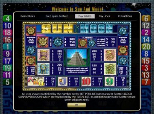Symbols: Gold Sun (wild, 1,000 coins), Silver Moon (wild, 1,000 coins), Mixed Sun and Moon (500 coins), Scattered Sun and Moon (50x the bet, scatters), Pyramid (bonus), Mayan Idol (300 coins), Snake Bracelet (200 coins), Medal (200 coins), Gold Jewel (150 coins), Ace (120 coins), King (120 coins), Queen (120 coins), Jack (100 coins), 10 (100 coins) and 9 (100 coins).