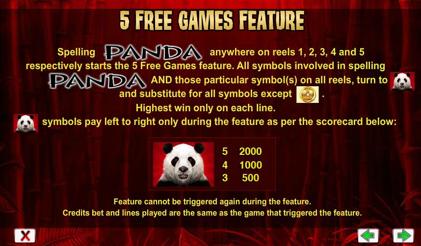 Wild Panda has 100 paylines, with 5 reels of 4 symbols each hosting them. The slot relies on free games, wilds and scatter symbols as its features. A $2,000 top payout can be won during free spins, while the base game offers $1,000.