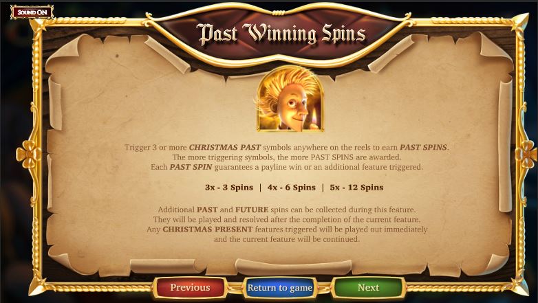 Three types of scatter symbols exist in the game, each one representing one of the Ghosts of Christmas.
