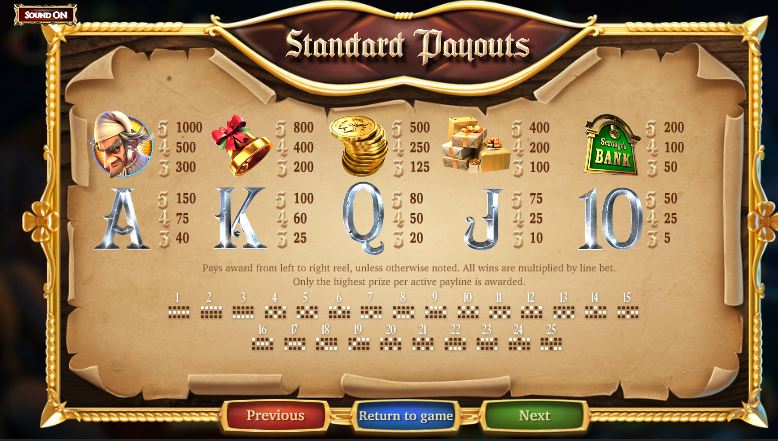 This is a recent release from BetSoft, so you will get a very good design from it, with Ebenezer Scrooge being shown on the left side of the screen, moving around and pointing his candle in different directions. The reels are on the right, surrounded by golden borders and having quite a few symbols on them that are made out of the same material. It’s a modern looking game, released just in time for the winter holidays.