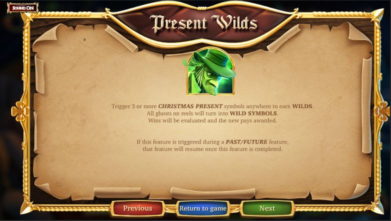This is what the Ghost of Christmas Present will bring you. Once again, the requirement is for 3+ Green Ghost scatters to be present on the reels. When this happens, all the symbols with ghosts on them that are present on the reels will be transformed into regular wild icons, hopefully bringing you more wins for that round.