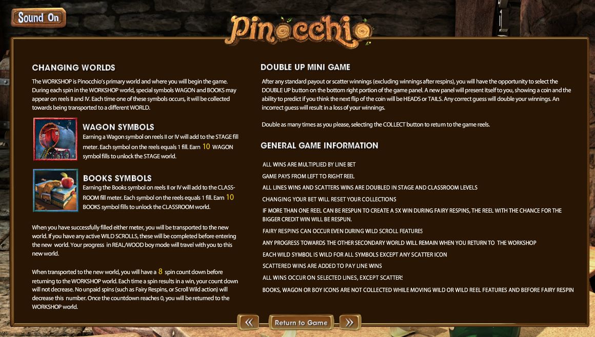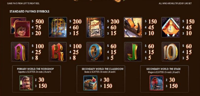 The game’s features are complex, so you can spend quite a bit of time in it before you see it all and take advantage of everything it has to offer. You can play in Wood Boy or Real Boy mode, you can be part of one of three worlds (Workshop, Classroom or Stage) and you can get wild symbols, scatters and free respins. All in all, it is a very complex mix that can be a lot of fun.