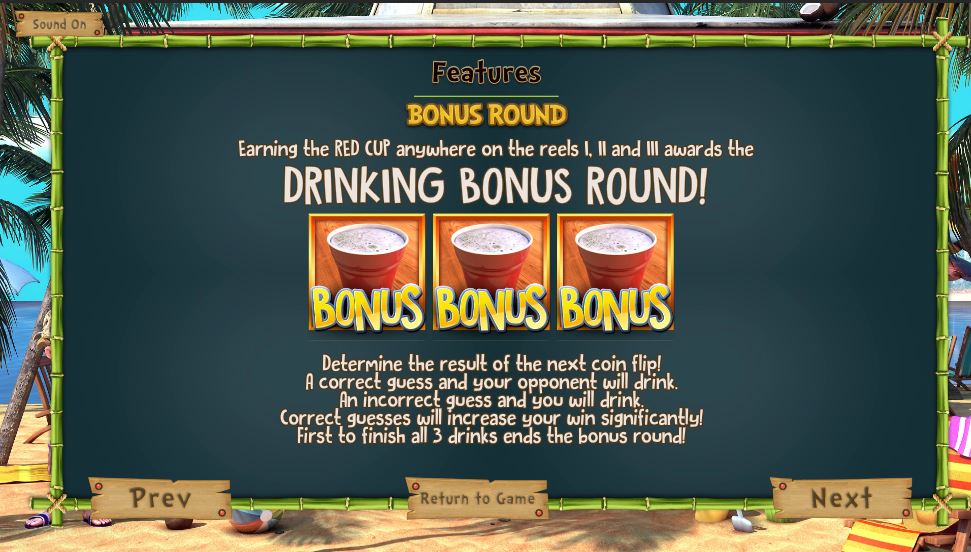 With the Red Cup symbol appearing in scattered positions on the first three reels, you will be able to trigger the Drinking Bonus Round. It’s a guessing game, where you have to pick the correct result of a coin flip, before it happens. If you guess correctly, the opponent is the one that has to drink. If it’s an incorrect guess, you drink up. The bonus round ends when one of the two contestants drinks three cups.