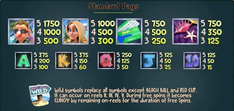The wild symbol’s image is that of a sign that says “Party Beach Wild”. This symbol is going to make an appearance only on the last four reels, so it will not be capable of forming up its own combinations of symbols. However, it will be more than capable of substituting for other symbols, helping them create their own combos. It will not be able to do that with the Red Cup or the Beach Ball feature symbols.