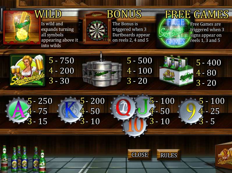 Symbols: Beer Glass (wild), Dart Board (bonus), Free Games Sign (scatter), Beer Maiden (750x), Kegs (500x), Beer Bottles (400x), Ace Cap (250x), King Cap (200x), Queen Cap (100x), Jack Cap (100x), 10 Cap (100x) and 9 Cap (100x).