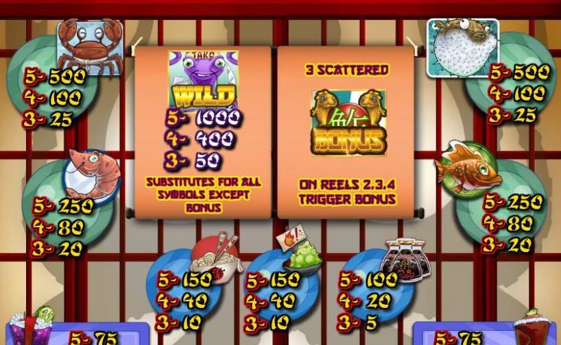 Symbols: Lizard (wild, 1,000 coins), Two Fish (bonus), Crab (500 coins), Puffer Fish (500 coins), Crustacean (250 coins), Fish (250 coins), Noodle Bowl (150 coins), Wasabi (150 coins), Soy Sauce (100 coins), Sushi (75 coins) and Sashimi (75 coins).