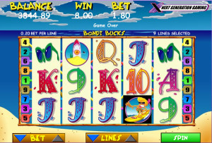 It’s easy enough to place a bet in Bondi Bucks, not to mention cheap. You have only 9 paylines that you can activate as you see fit, and each one gets a single coin. That coin has a maximum value of $0.20, so with 9 lines active you can wager $1.80 per spin.