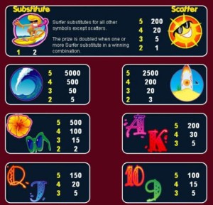 First, let’s take a look at what the wild symbol can do for you. The image chosen for it is that of the Surfer, and when you see it you already know that you get something out of it, since a 2x prize is offered for each symbol of this type that appears. It can be much more useful than that though, as it acts as a substitute and helps you get new combinations formed. Wilds apply 2x multipliers to the wins you get with their assistance. They can’t replace scatter symbols, but that’s their only limitation.