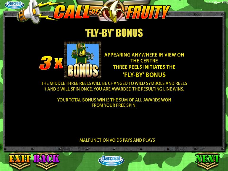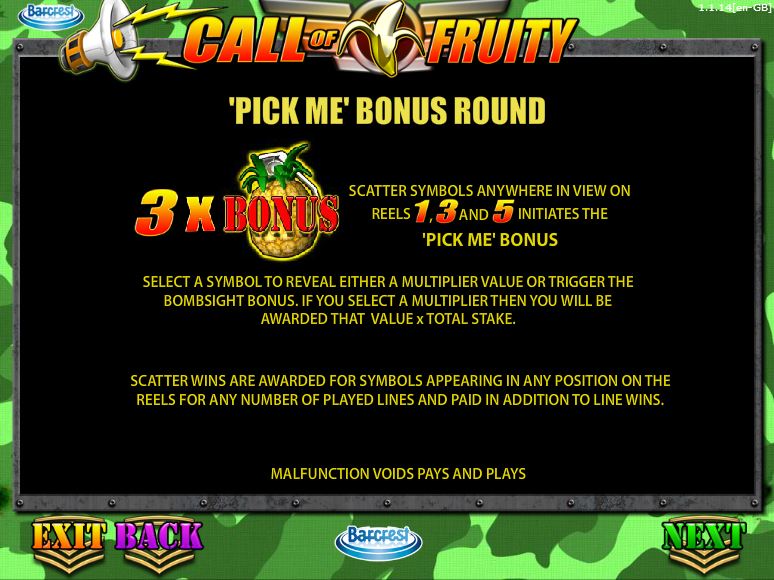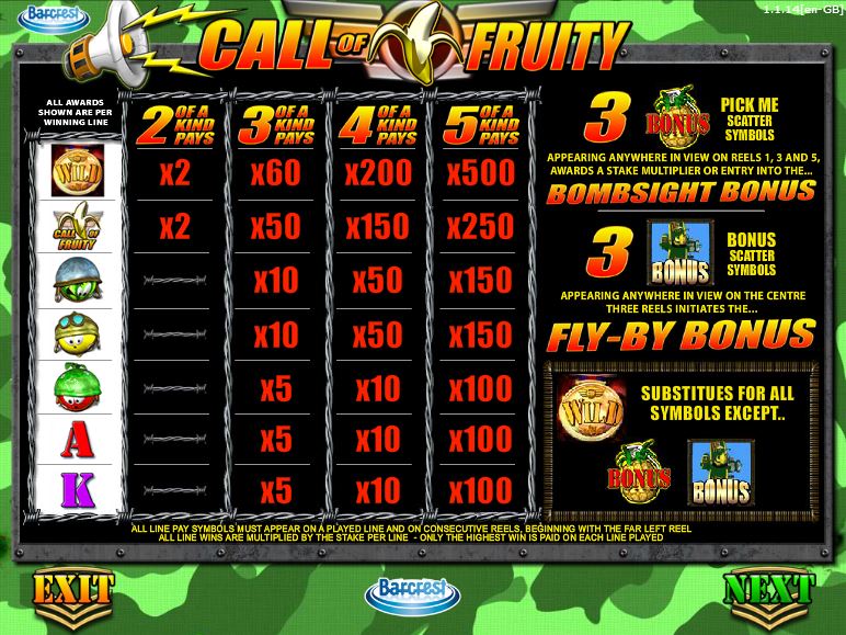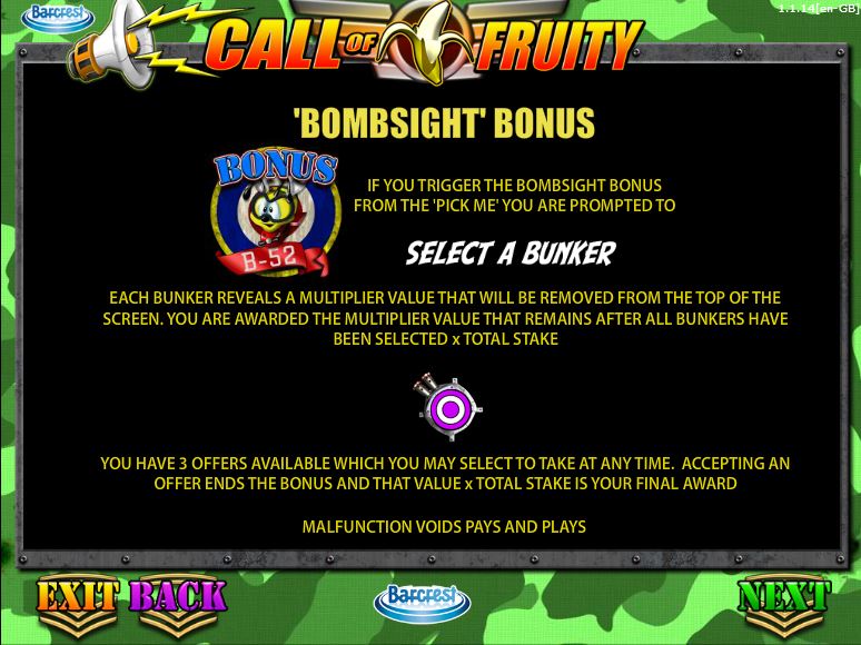 There are multiple bonus games in Call of Fruity, each one having its own bonus symbol to trigger it. There is also a wild symbol, a common choice for a feature from a modern title.