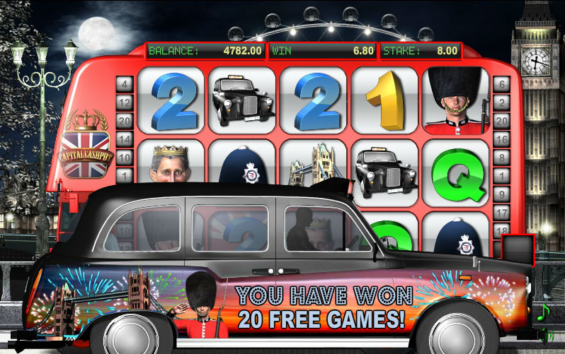 The design in Capital Cashpot seems to be dedicated to the capital of United Kingdom, to London. There are many of the things you would see there used as symbols, including black cabs, the Queen’s guards, Prince Charles, the Big Ben, and so on. There are some standard looking poker cards as well, but unfortunately that can’t be helped. The reels are placed on the side of a big red bus, with the background picture showing you London at night, with Big Ben visible.