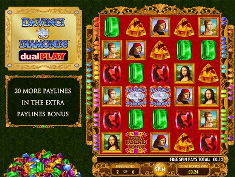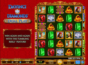 This is the Dual Play version of Da Vinci Diamonds, and IGT also offers a regular version of this slot. In both of them, the focus is obviously on Leonardo Da Vinci, one of the great men of the Renaissance period, famous because of the huge accomplishments that awe us to this day. It’s basically a slot machine with two games on the same screen, so you have double the number of paylines and chances to win.