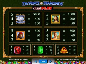 Symbols: Wild Gem (wild), Extra Paylines Bonus (bonus), Da Vinci Diamonds Logo (5,000 coins), Mona Lisa (1,000 coins), Leonardo da Vinci (500 coins), Lady Painting (300 coins), Red Ruby (100 coins), Green Emerald (100 coins) and Orange Amber (80 coins).