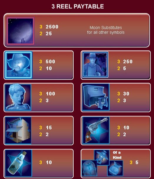 Symbols: Full Moon (wild, 2,500 coins), Cowboy (500 coins), Cowboy and horse (250 coins), Dancer (100 coins), Piano (30 coins), Saloon (15 coins), Six Shooter (10 coins), Bottle (10 coins), Headstone (5 coins), Pot (5 coins) and Lamp (5 coins).