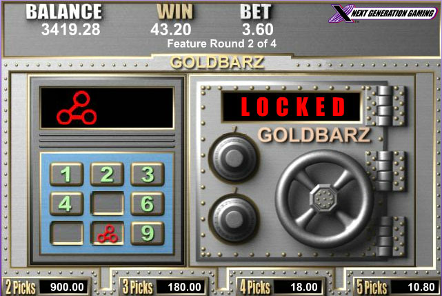 The bonus game of Goldbarz gets triggered when a minimum of three Safe scatter symbols are part of the reels. At that time, you get access to the feature and you have a maximum of 10 chances to open the safe.