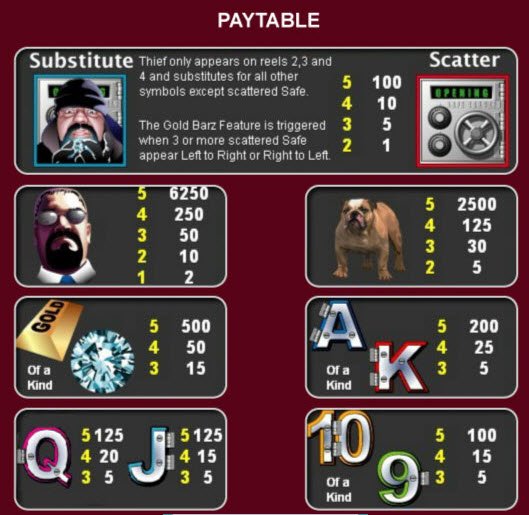 Symbols: Thief (wild), Safe (scatter, 100x bet), Boss (6,250 coins), Bulldog (2,500 coins), Gold Bar (500 coins), Diamond (500 coins), Ace (200 coins), King (200 coins), Queen (125 coins), Jack (125 coins), 10 (100 coins) and 9 (100 coins).