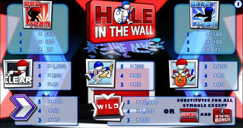 Hole in the Wall looks like a slot machine which is themed around a game show, and that’s not something that happened by accident. Inspiration for this game came from a TV game show with the same name, which was made for the United States, but which didn’t catch on beyond the few seasons that it aired. Featuring teams of up to three players, the game asked them to go through holes in moving walls, trying not to fall in the pool found below them. The slot is an IGT creation.