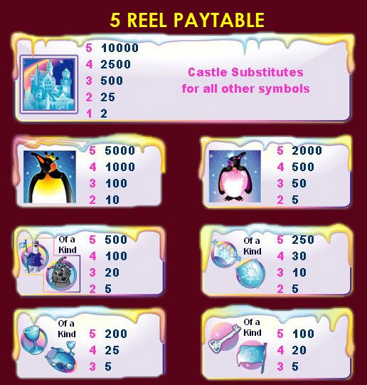 Symbols Free Spins: Ice Castle (10,000 coins, wild), King Penguin (5,000 coins), Queen Penguin (2,000 coins), Polar Bear (500 coins), Seal Pup (500 coins), Crown (250 coins), Shield (250 coins), Goblet (200 coins), Feast (200 coins), Key (100 coins) and Flag (100 coins).