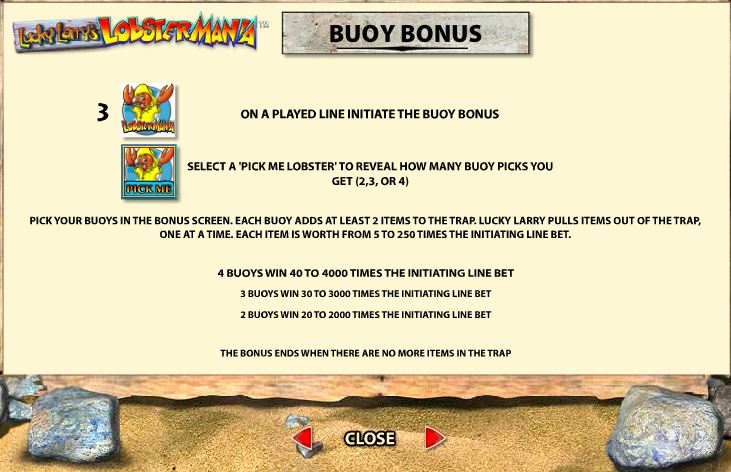 The Lobster Mania symbol is needed on the same active line, where it has to appear a minimum of three times. You are asked to choose one of those lobsters, and your pick will reveal how many buoy picks you get (between 2 and 4).