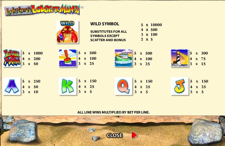 The Cool Lobster, meaning that it’s wearing sunglasses and holding a drink in one of the claws, acts as the wild element of Lobster Mania. The symbol can obviously substitute for other symbols, for all regular ones at least, and it can also offer some of its own prizes to the players. The highest payout is worth 10,000 coins for five symbols, but you get paid for as little as two.