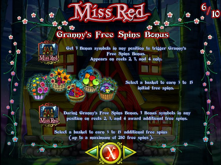 Symbols: Miss Red (50 coins), Wolf (40 coins), Granny’s House (scatter), Granny (150 coins), Wood cutter (125 coins), Rabbit (25 coins), Squirrel (25 coins), Mushrooms (15 coins), Pine cone (15 coins), Berries (15 coins) and Wild Flowers (15 coins).