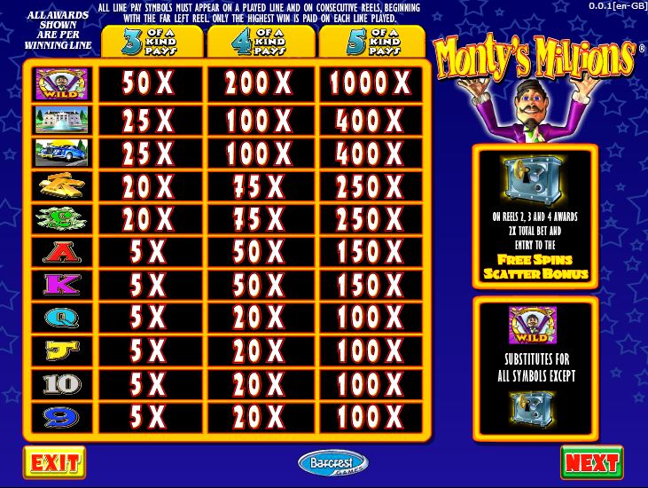 The slot’s best paying symbol, the wild with Monty on it, will offer up to 1,000 coins, in exchange for one coin wagered per line. You only get $10,000 cash in the best case scenario.