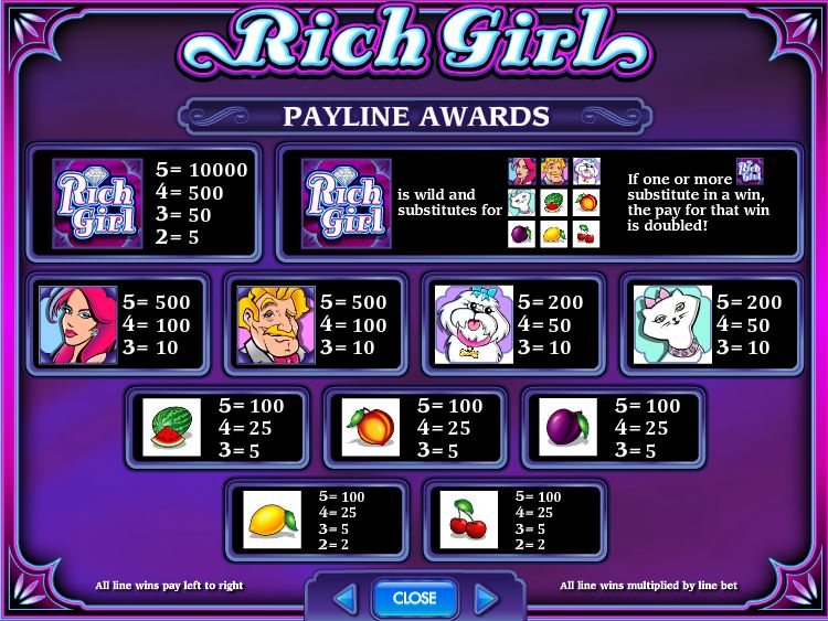 First, let’s take a look at the wild symbol, which uses the image of the Rich Girl Logo. It’s not any different from any other wild symbol, being capable of substituting for any regular icon that tries to form its own combo. As long as the wild appears in the right position on a payline, it takes whatever role is needed of him and it applies a 2x multiplier to the prize. When multiple wilds land on a line, from left to right, they are able to create their own combination and the reward goes up to 10,000x.