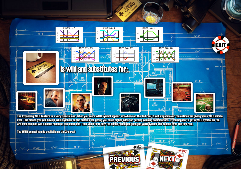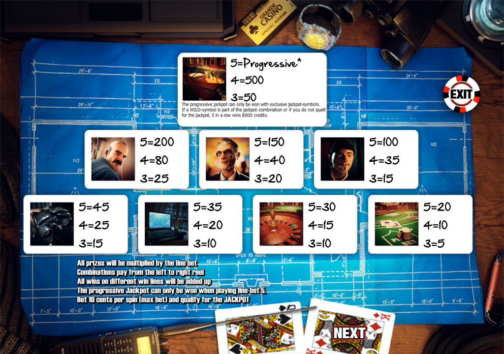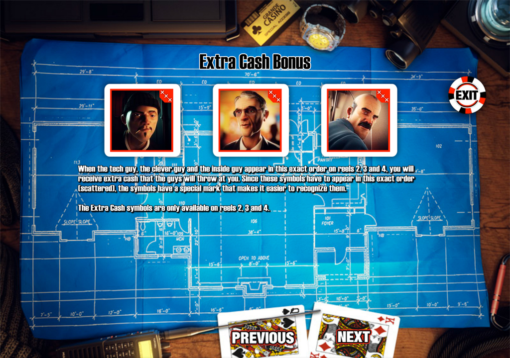 Symbols: Grande Casino Card (wild), Spin Wheel (bonus), Vault Door (scatter), Escape Boat (progressive jackpot), Inside Guy (200x), Smart Guy (150x), Tech Guy (100x), Night Vision Goggles (45x), Laptop (35x), Roulette (30x) and Card Table (20x).