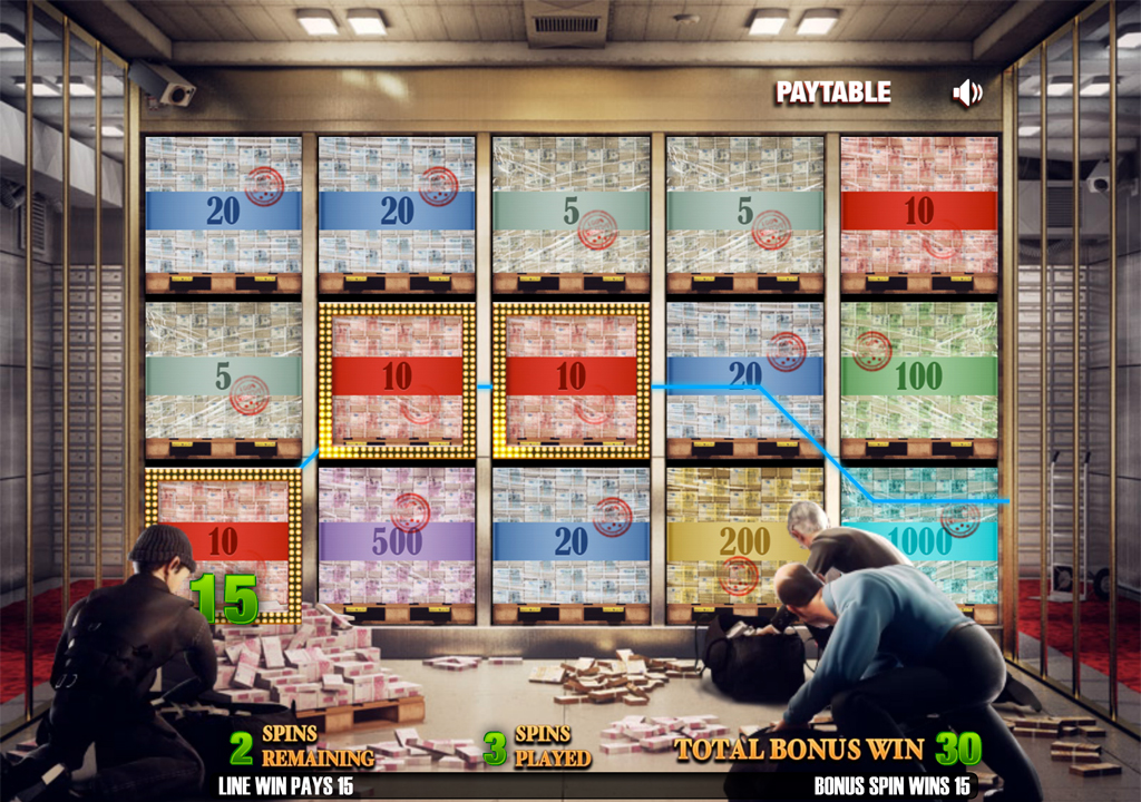 The free spins have their own symbols which can form combinations. The action now takes place inside the vault, where the robbers are shown at the bottom as they’re stuffing bags with money. The back wall serves as support for the reels, while symbols are stacks of cash instead of the usual icons. They can form combinations of three to five symbols, paying as much as 5,000x when combinations form. These spins come with both regular and scatter prizes.