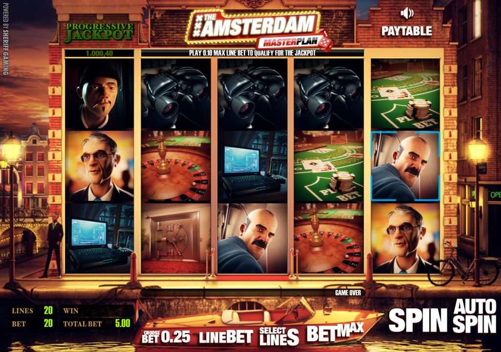 Amsterdam Master Plan is one of the slot machines that is offered by Microgaming, and by the looks of it it’s one of their better titles, giving you great graphics, loads of cool features and even progressive jackpots if you’re truly lucky. The casino robbery takes place in Amsterdam, one of Europe’s great cities, and you can even see parts of it behind the game area.