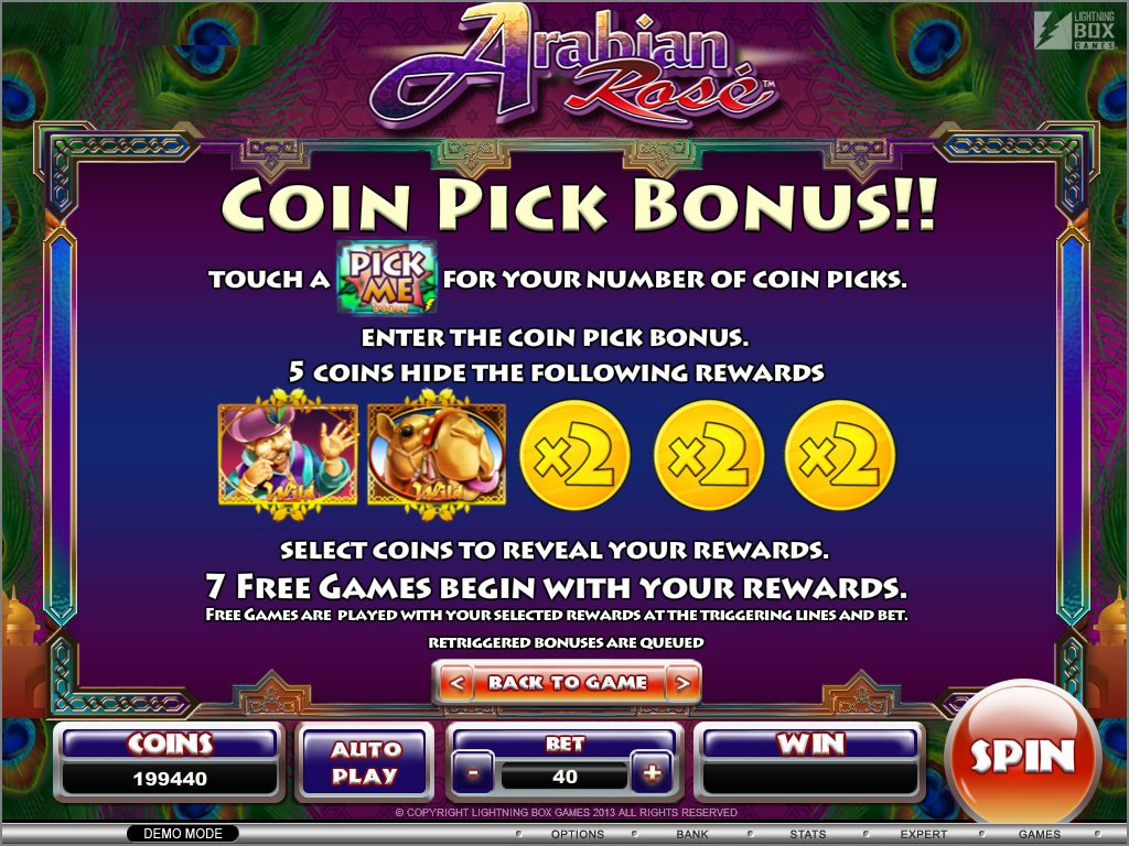 When at least three Arabian Rose scatter symbols are present on the reels, you will be offered a feature called a Coin Pick Bonus. You click on one of the Pick Me symbols first, to find out how many coin picks you have to work with.