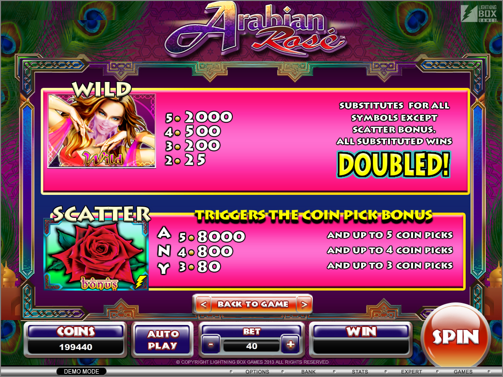 Arabian Rose has more than a few paylines, 40 of them used on its 5 reels. The slot’s offer also includes wild symbols, scatters, a Coin Pick feature with free spins and with multipliers. The big prize is worth $16,000.