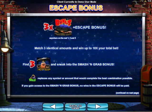 If you located three symbols with the Robber, then you trigger the bonus feature called Smash ‘n Grab. This might give you the new feature, but it also cancels the wins you got along the way in the Escape Bonus.