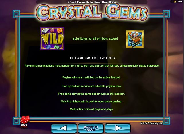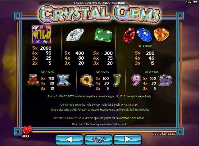 This Crystal Gems slot is offered by all online casinos with Microgaming software, playable either in practice or in real money mode.