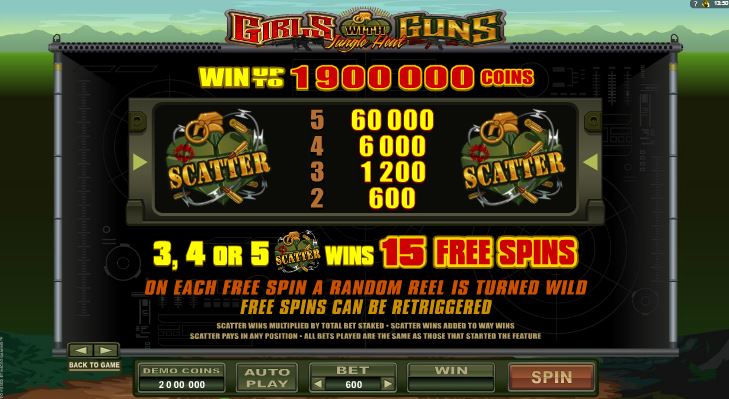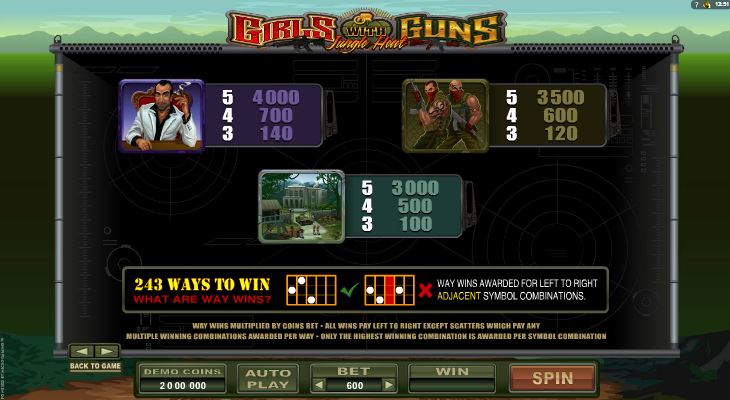 Jungle Heat, a Girls with Guns slot, will offer you 243 paylines and 5 reels. You will get a couple of wilds from it, scatters, free spins and random wild reels. As for the slot’s bigger prizes, they go as high as $3,000.