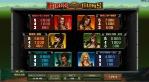 If there is one thing that is true for all the Girls with Guns slots is the fact that they’re all attractive, both thanks to the symbols which have the gorgeous girls on them and because of the way the rest of the design was approached. The setting is in the middle of a South American jungle, with symbols consisting of girls, villains and lots of guns and ammo, mostly placed alongside playing cards.