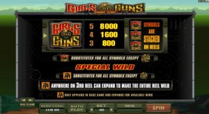 The first of the two wilds would be the one with the Girls with Guns Logo. This is the stacked wild, appearing on all the reels and it is capable of replacing any other symbol, with the only exception being the scatter. Since it’s a stacked symbol, you often get more than one on the reel and the odds of new combos forming are quite good. It also means that it can form multiple combinations of its own this way, so the 400x multiplier, though quite low, is not a problem.