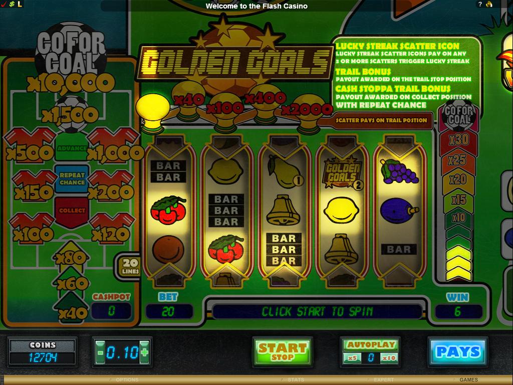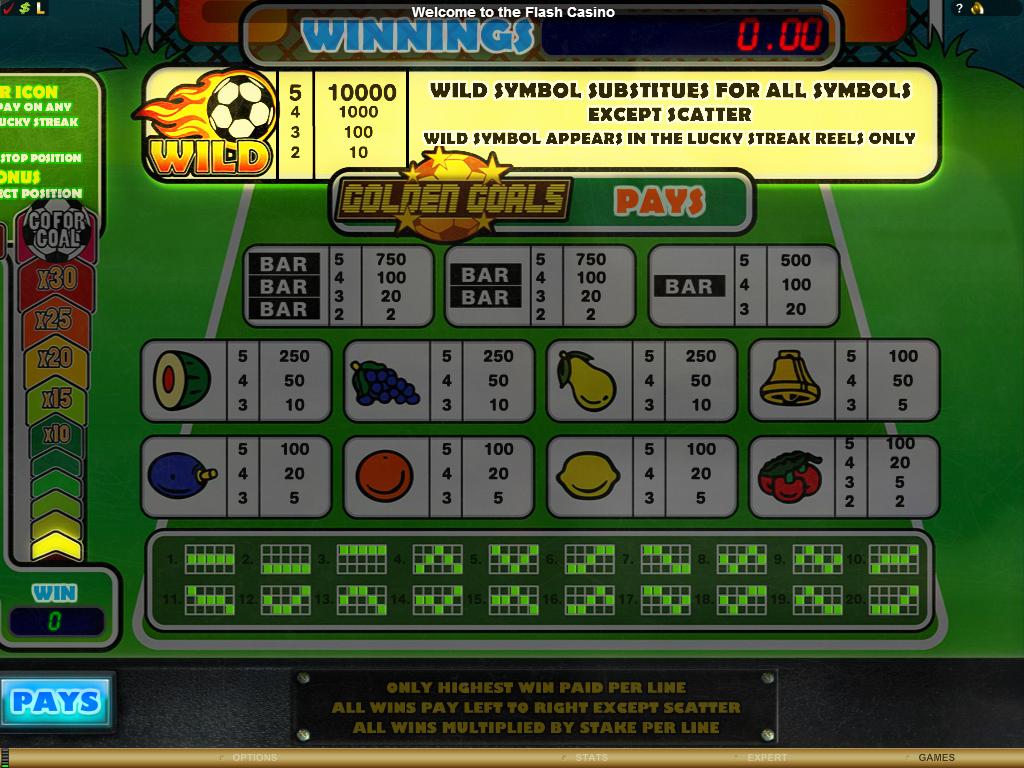 You will find Golden Goals at any online casino which chooses to use software from Microgaming, playable either for free or for real money.