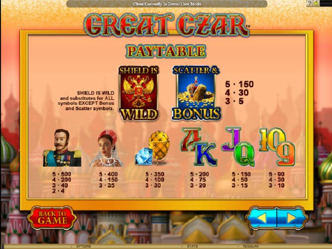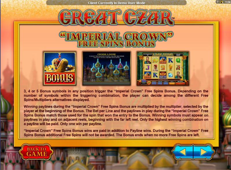 The Great Czar slot machine is offered through the Microgaming platform, so if you want to play it for real or just to practice, look out for casinos that use it.