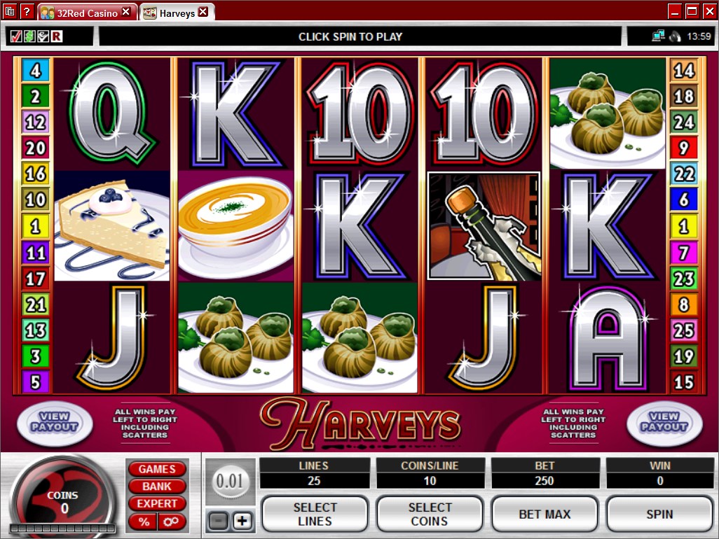 Harveys might be a culinary themed slot machine, but it’s not your typical game of this type. It has some lovely features you can hang on to, but it’s also themed around a high class restaurant, the kind of place where you can go and order a nice plate of snails, or some other plate of food that is beautifully decorated and just as tasty. In most cases, food themed slots focus more on the Chef or on regular types of food, but Harveys tries to bring a bit of class to the experience. Microgaming is the creator of this slot machine.